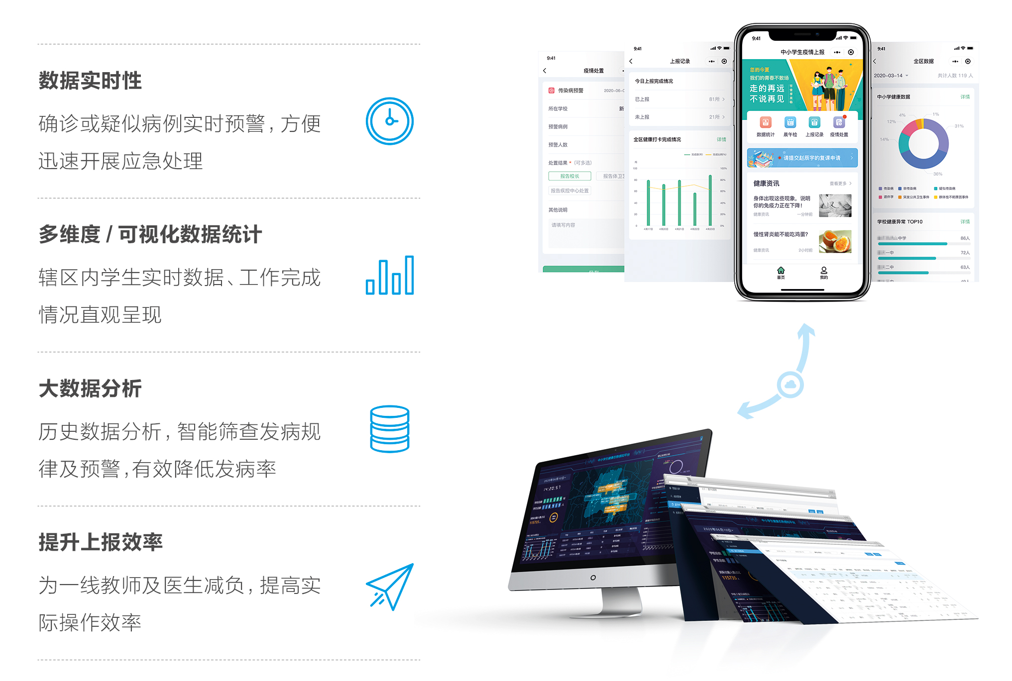 传染病疫情上报平台,是针对中小学校用于学生晨午检数据上报的管理平台。平台分为小程序端和电脑端,主要用户群体为教委保健所、学校班主任、学校疫情上报人(校医、保健医生)、学校校领导。,快速诊断,无障碍沟通,大大提高中小医疗机构的服务人数和服务质量
